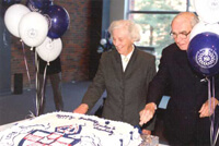 Judge William Mitchell and Mrs. Margaret Bradley Mitchell slice the “Bishop’s University Birthday Cake” in the lobby of the Centennial Theatre, December 9th, 1993.